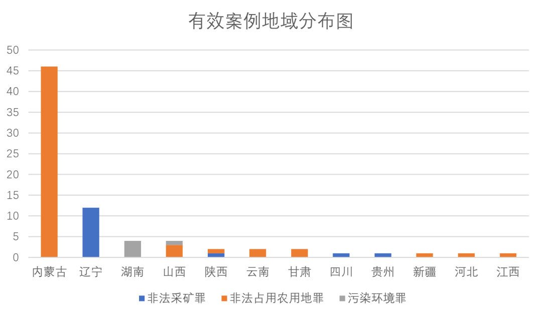 從上圖可以看出,在煤炭行業(yè)環(huán)境資源保護(hù)領(lǐng)域中,單位犯罪集中分布在中西部地區(qū)。
