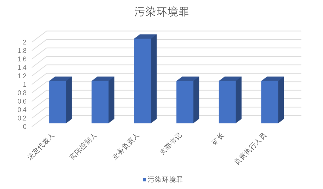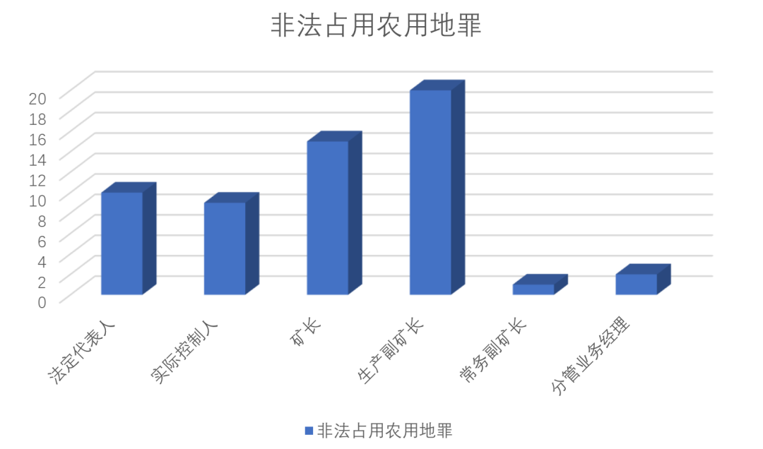 從上圖分析可知,在非法采礦罪中,定罪處罰比例最大的職位是法定代表人和實(shí)際控制人,負(fù)責(zé)技術(shù)的工程師,負(fù)責(zé)生產(chǎn)、掘進(jìn)、通風(fēng)、機(jī)電等與采礦相關(guān)的分管礦長亦可能被處罰。在非法占用農(nóng)用地罪中,定罪處罰比例最大的職位是分管生產(chǎn)的副礦長,其次為礦長。相反,法定代表人被處罰比例不高。在污染環(huán)境罪中,定罪處罰比例最大的職位是業(yè)務(wù)負(fù)責(zé)人,法定代表人、實(shí)際控制人、支部書記、礦長等參與決策的人員以及具體負(fù)責(zé)執(zhí)行的人員均可能被處罰。因此,在上述單位犯罪中,并非僅處罰法定代表人或?qū)嶋H控制人,只要是負(fù)責(zé)或?qū)嵭蟹缸镄袨椋陀锌赡鼙欢ㄗ锾幜P。