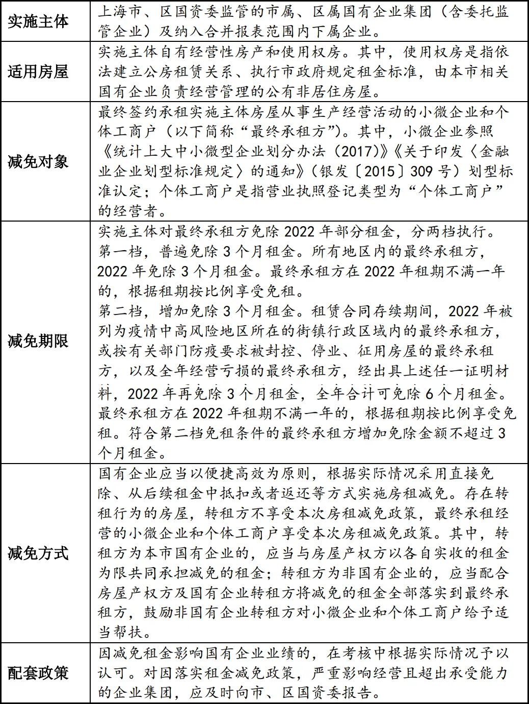 2022年3月31日,上海市國(guó)有資產(chǎn)監(jiān)督管理委員會(huì)會(huì)同上海市城鄉(xiāng)建設(shè)和管理委員會(huì)、上海市房屋管理局制定了《上海市國(guó)有企業(yè)減免小微企業(yè)和個(gè)體工商戶房屋租金實(shí)施細(xì)則》,減免的適用情況及方式具體梳理如下: