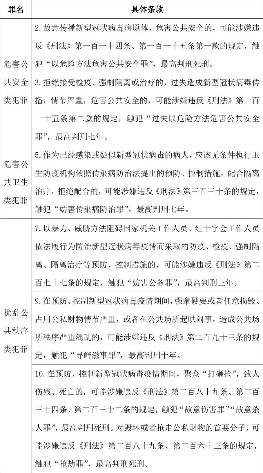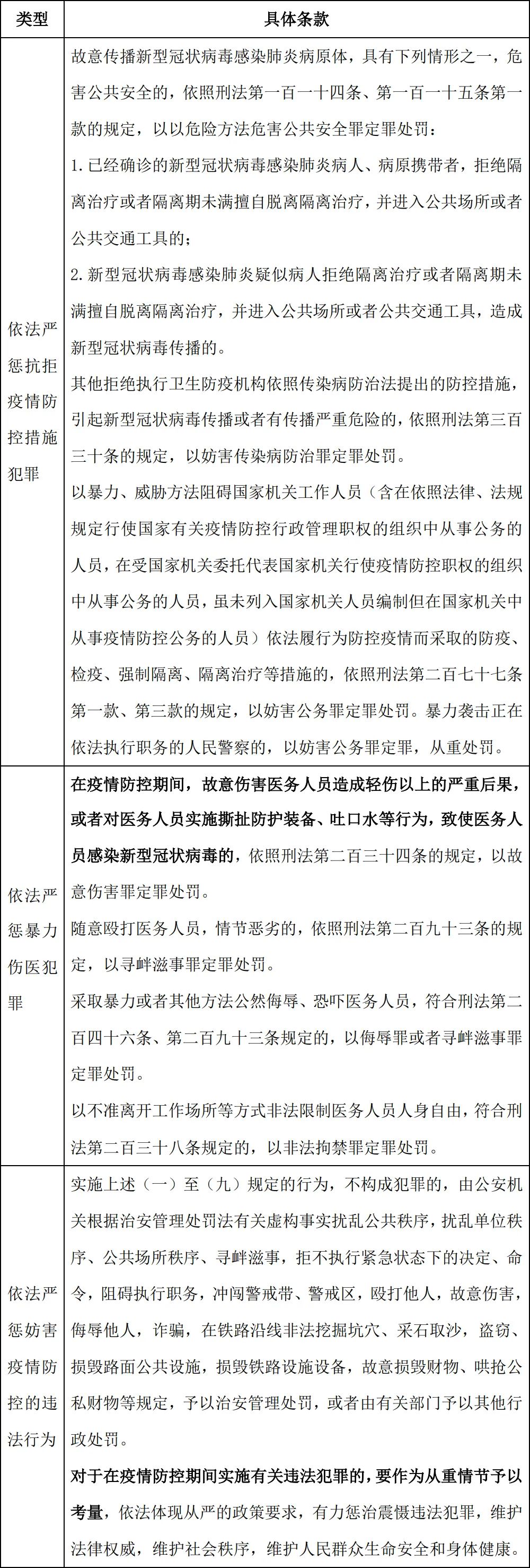 為落實(shí)對于新型冠狀病毒疫情防控各項(xiàng)部署要求,黑龍江高院制發(fā)《關(guān)于嚴(yán)厲打擊涉疫情防控相關(guān)刑事犯罪的緊急通知》,依法嚴(yán)懲疫情防控涉及的9類36種刑事犯罪,但未就傷害醫(yī)務(wù)人員的行為進(jìn)行明確界定。其中與涉醫(yī)違法行為相關(guān)的條款如下: