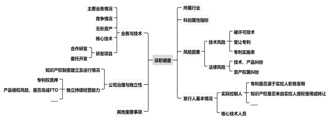 就針對科創板擬上市公司進行的知識產權盡職調查而言,可以主要從如下圖所示的所屬行業、科創屬性指標、風險因素、發行人基本情況、業務與技術、公司治理與獨立性及其他重要事項等六方面展開。