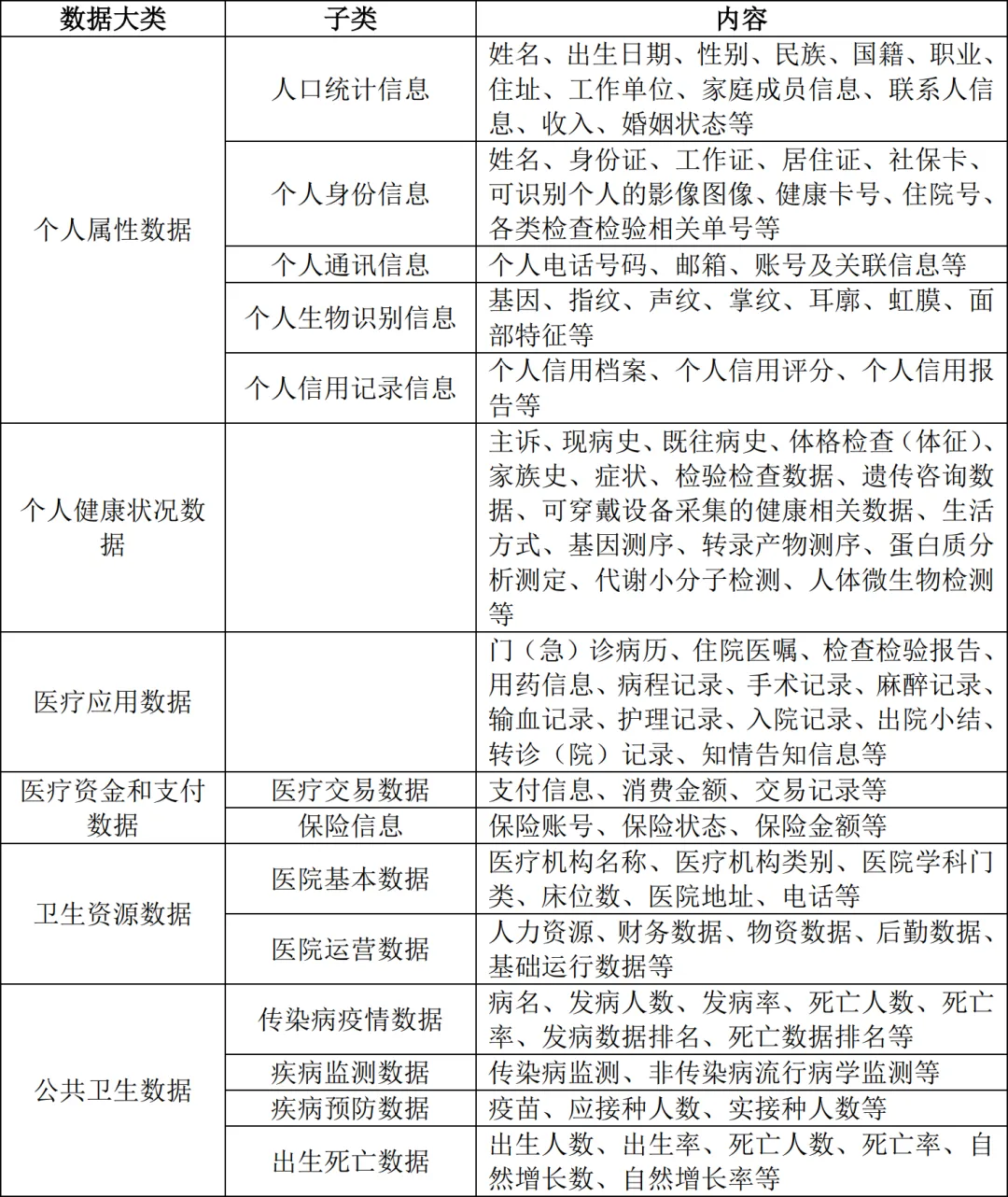 按照《廣東省健康醫療數據安全分類分級管理技術規范》,健康醫療數據可以分為個人屬性數據、健康狀況數據、醫療應用數據、醫療支付數據、衛生資源數據以及公共衛生數據等類別。