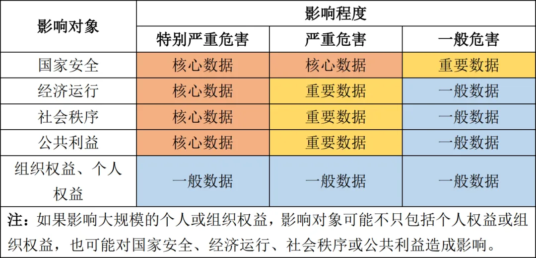 根據數據在經濟社會發展中的重要程度,以及一旦遭到泄露、篡改、損毀或者非法獲取、非法使用、非法共享,對國家安全、經濟運行、社會秩序、公共利益、組織權益、個人權益造成的危害程度,將數據從高到低分為核心數據、重要數據、一般數據三個級別。