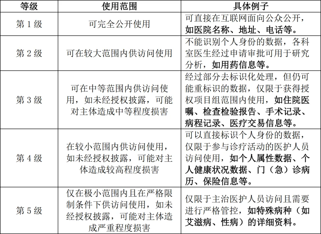 按照《信息安全技術 健康醫療數據安全指南》的要求,健康醫療數據可以根據數據重要程度、風險級別以及對個人健康醫療數據主體可能造成的損害和影響分為以下五級。