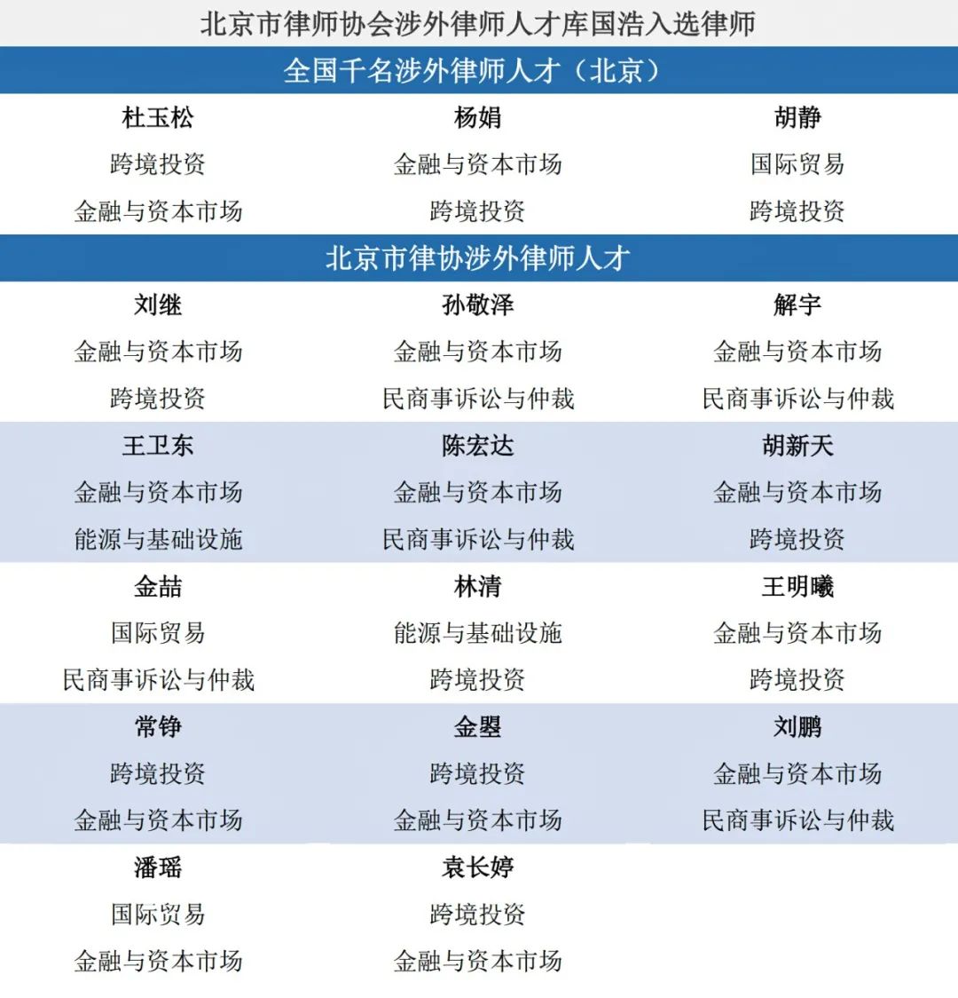 此次人才庫名單,系北京市律師協會在原有涉外律師人才庫的再次擴充,體現出我國涉外律師隊伍建設的卓著成效與涉外法律服務業務的蓬勃發展。入選該名單的17位律師執業范圍涵蓋金融與資本市場、跨境投資、民商事訴訟與仲裁、國際貿易、能源與基礎設施等涉外業務領域,是一批通曉國際規則、具有世界眼光,胸懷國際視野的高素質涉外律師人才。
