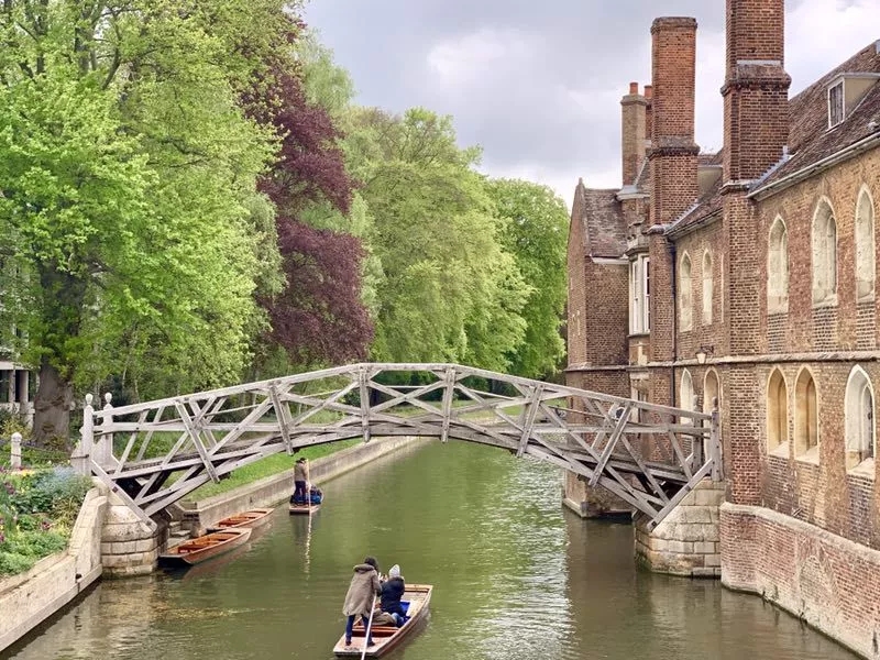 泛舟在靜水流淌的劍河上,穿行在各大學(xué)院的古老建筑間,行走在散發(fā)花木氣息的草坪上,慢慢感受劍橋的美。迎面來到的是一座誤傳為牛頓所建造的數(shù)學(xué)橋。實(shí)際上,當(dāng)初這木質(zhì)的數(shù)學(xué)橋,在1749年由威廉?埃斯里奇設(shè)計(jì)、詹姆斯?埃塞克斯建造,陪伴著劍河沿岸最古老的建筑——紅磚壘砌的劍橋大學(xué)女王學(xué)院院長官邸,走過了250多個(gè)春秋。