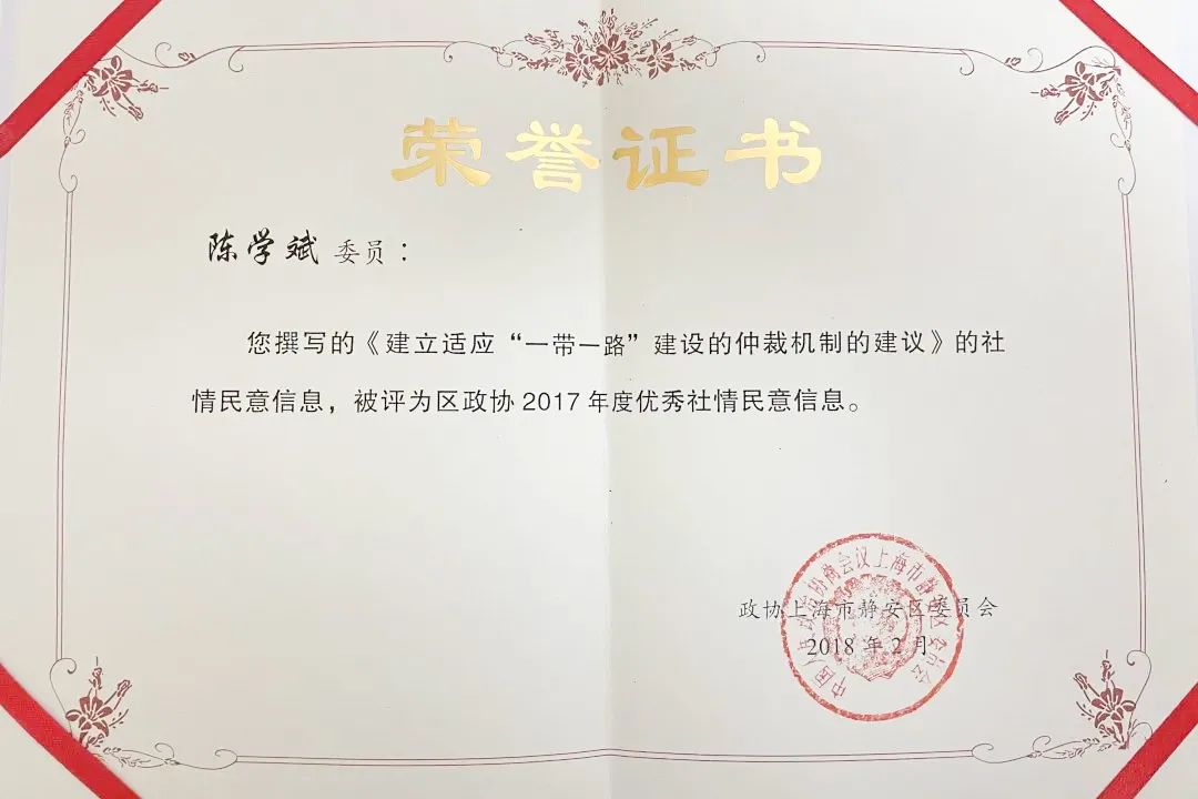 其后,建議的部分意見在中央深改組第二次會議審議通過的關于“一帶一路”爭端解決機制的政策意見中得以體現,時任靜安區委統戰部部長的凌惠康同志贊譽這一建議是“優質建言轉化成了實實在在的政策成果”,并予以表彰。