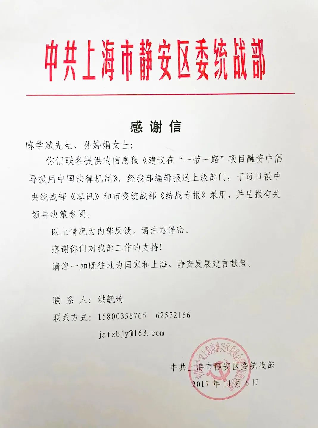 陳學斌及同行律師頗感不能理解,覺得“必須將這些情況反映上去,并給出相應的建議?!?017年,他們合作寫成《建議在“一帶一路”項目融資中倡導援用中國法律機制》,通過上海市靜安區委統戰部上報至上海市委統戰部。在被上海市委統戰部《統戰專報》采納之后,建言由統戰直通車上報中央統戰部,被中央統戰部《零訊》采用,并呈報中央有關領導。