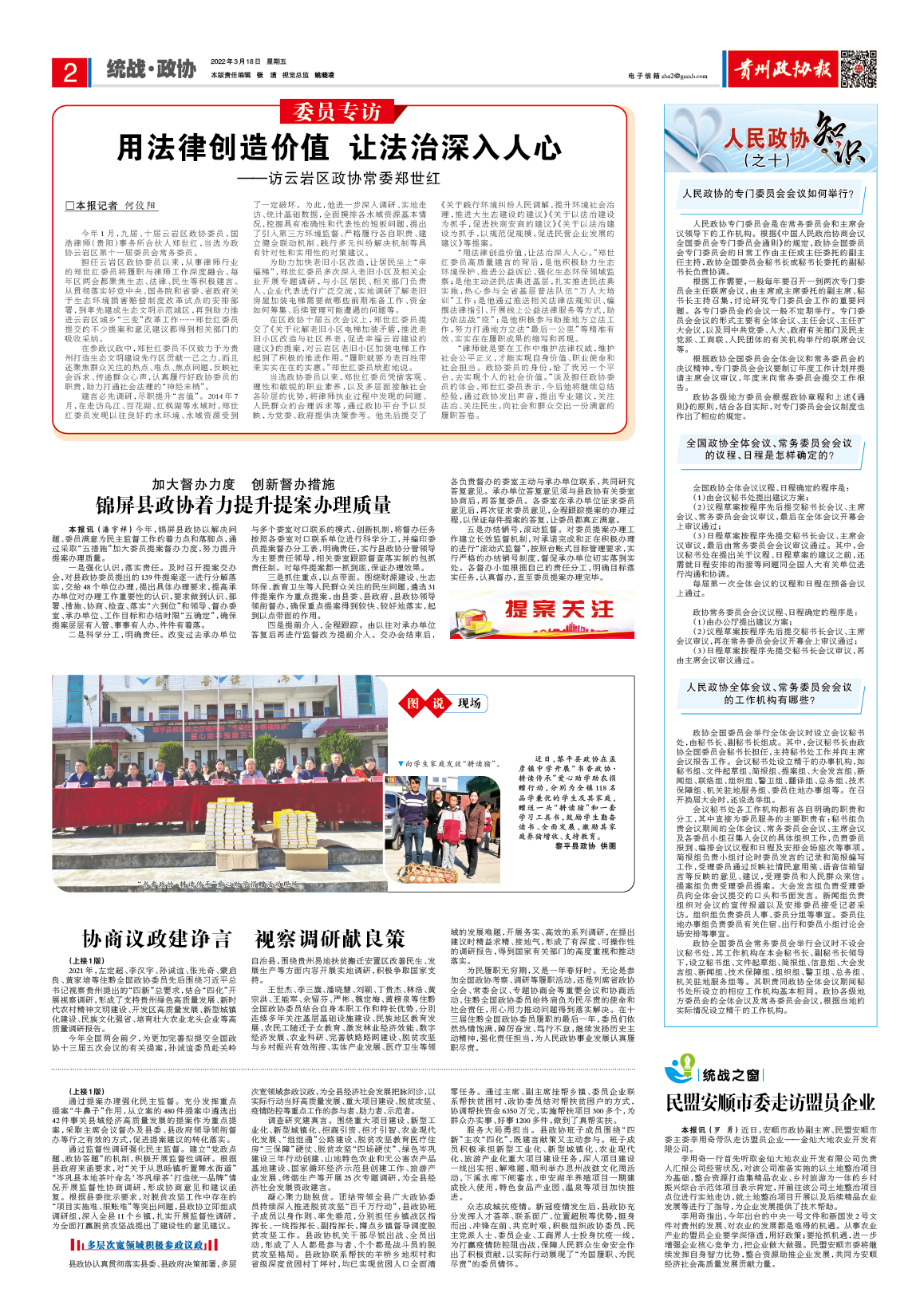 擔任云巖區政協委員以來,從事律師行業的鄭世紅委員將履職與律師工作深度融合,每年區兩會都聚焦生態、法律、民生等積極建言。從貫徹落實好黨中央、國務院和省委、省政府關于生態環境損害賠償制度改革試點的安排部署,到率先建成生態文明示范城區,再到助力推進云巖區城鄉“三變”改革工作……鄭世紅委員提交的不少提案和意見建議都得到相關部門的吸收采納。