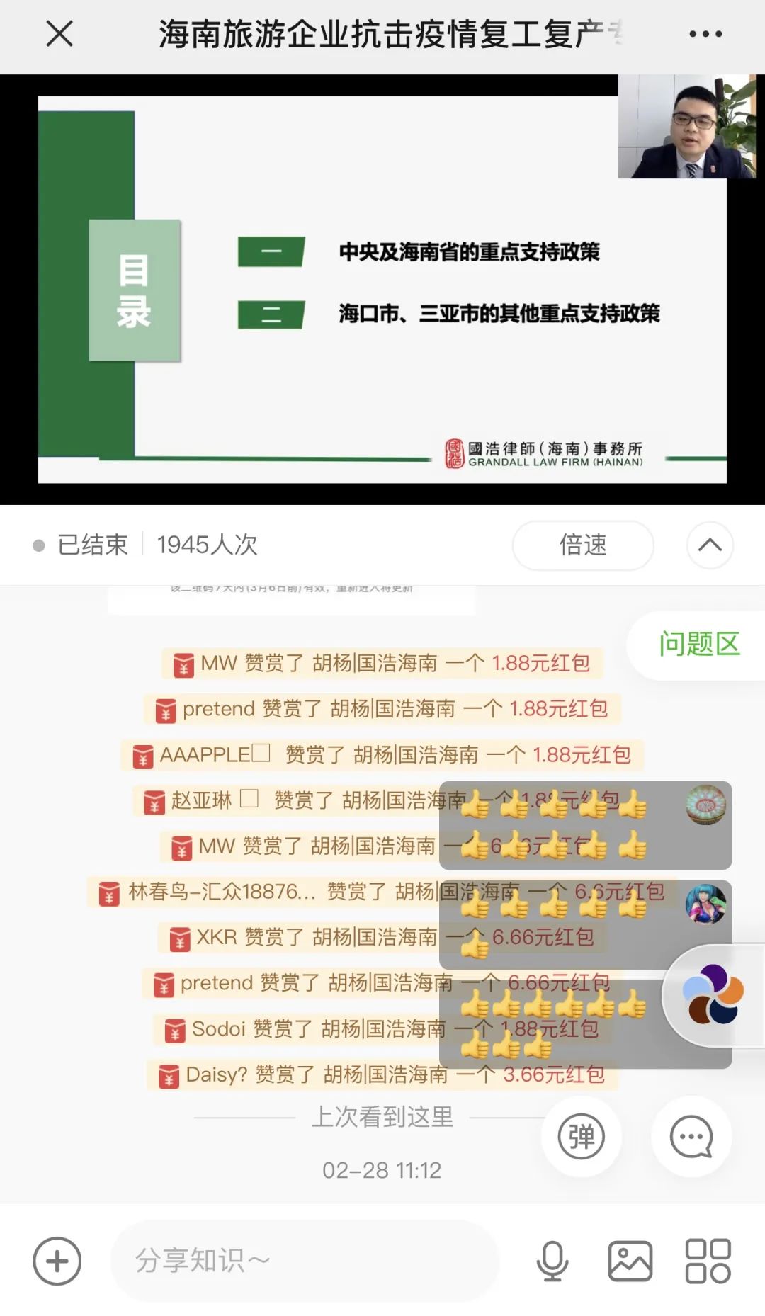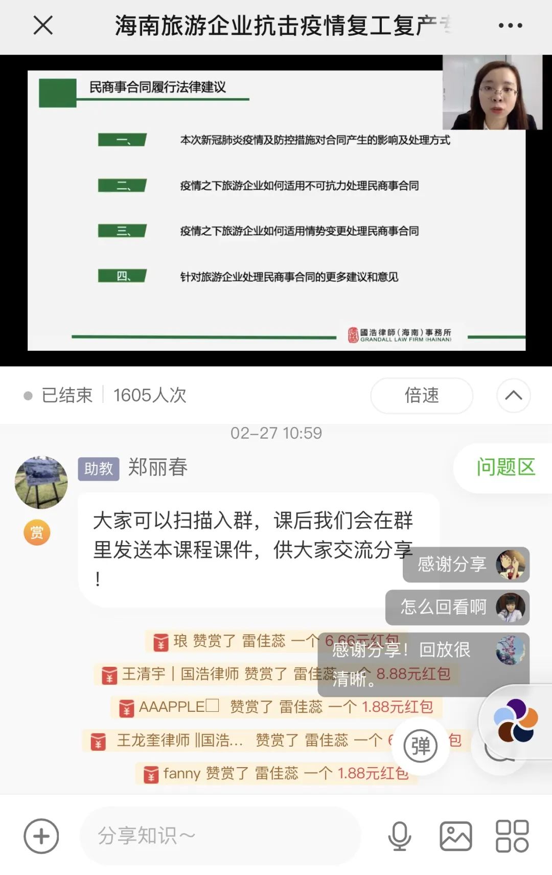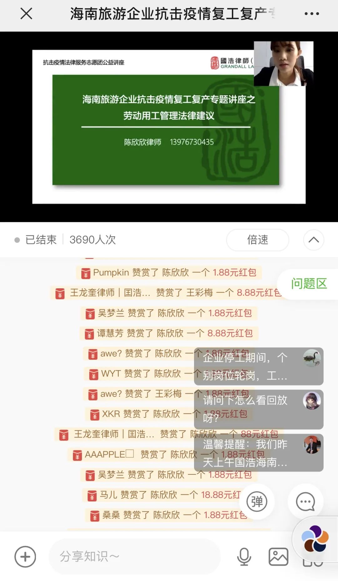 依托2020年公益法律服務(wù)群眾基礎(chǔ),國(guó)浩海南在省普治辦、省司法廳的大力支持下,再次與省旅游協(xié)會(huì)開展海南省旅游行業(yè)抗疫公益線上法律講座課程。公益法律講座共14場(chǎng),不僅涵蓋旅游業(yè)在疫情之下可能會(huì)涉及的勞動(dòng)用工、房屋租賃、旅游合同糾紛、金融借款糾紛、違法行為處置等問題,還涉及個(gè)人信息保護(hù)、涉疫刑事犯罪罪名、傳染病防治法律法規(guī)等相關(guān)法律問題的解讀,超10000人次觀看、76000余人點(diǎn)贊,獲得中國(guó)普法、海南日?qǐng)?bào)、法治海南、海南廣播電視臺(tái)等多家新聞媒體的廣泛報(bào)道,社會(huì)反響熱烈。
