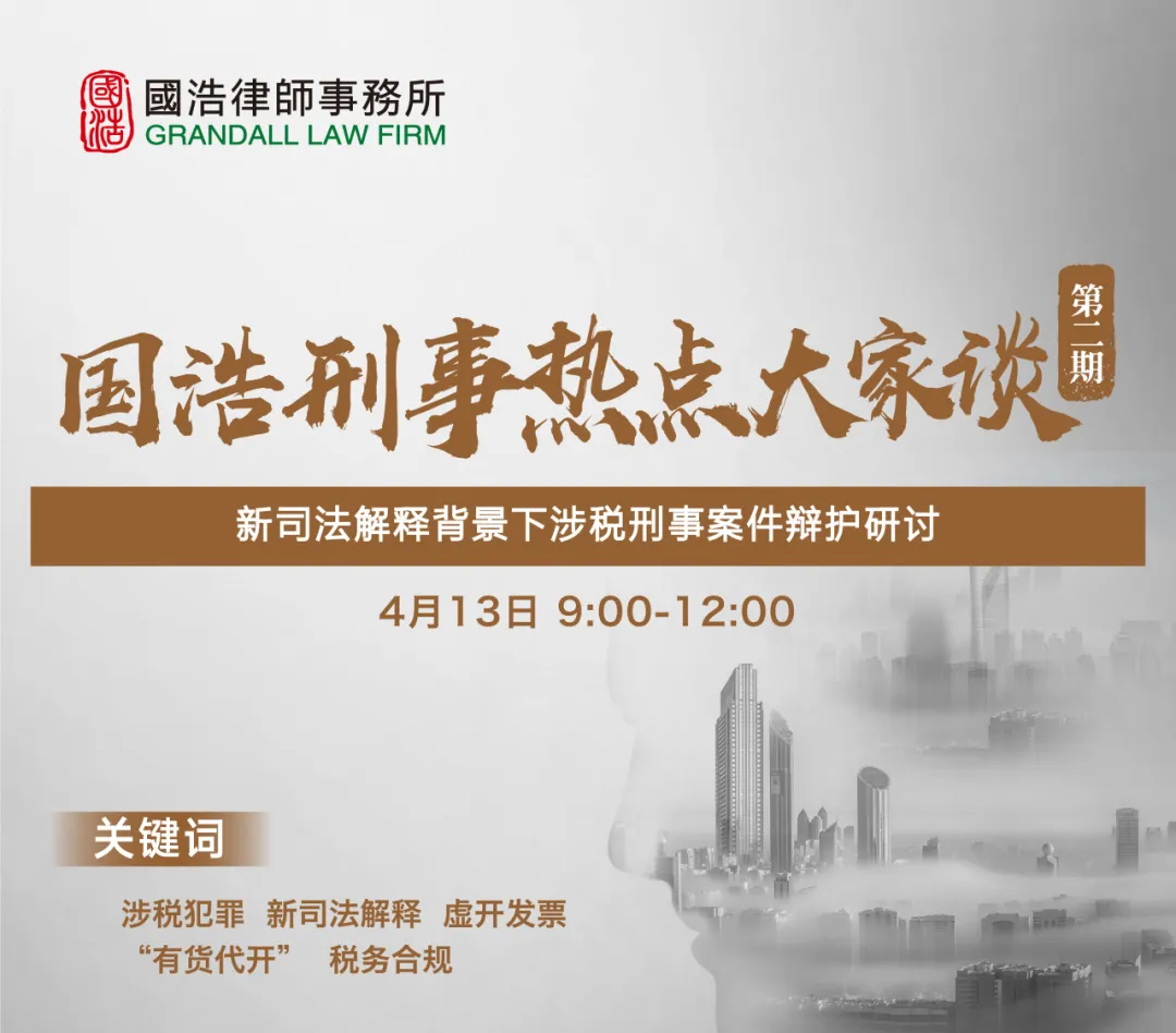 編者按:2024年4月13日,國浩刑事業務委員會暨法律研究中心(以下簡稱“國浩刑事業務委員會”)與國浩律師學院聯合主辦了第二期“國浩刑事熱點大家談”活動。八位國浩刑事律師圍繞“新司法解釋背景下涉稅犯罪”主題,從新司法解釋規定的變化、虛開發票、“有貨代開”、稅務合規等不同角度對相關問題在線進行了研討,吸引了眾多刑事律師觀看。