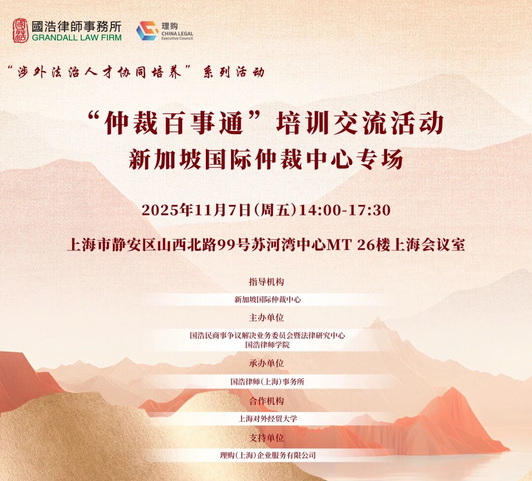 11月7日,由國浩民商事爭議解決業(yè)務(wù)委員會暨法律研究中心(以下簡稱“國浩民商事爭議解決業(yè)務(wù)委員會”)、國浩律師學(xué)院聯(lián)合主辦,國浩律師(上海)事務(wù)所承辦,新加坡國際仲裁中心(SIAC)(以下簡稱“新國仲”)指導(dǎo),上海對外經(jīng)貿(mào)大學(xué)參與合作,理購(上海)企業(yè)服務(wù)有限公司提供支持的“仲裁百事通”培訓(xùn)交流活動(新國仲專場)成功舉辦。本次活動采用“線下會議+線上同步直播”的形式,共有30余人線下參加,近5,000人次線上觀看。
