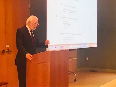 上午,斯坦福法學院的Paul Goldstein教授為大家講授了國際版權法課程。Paul Goldstein教授是全球公認的知識產權法專家,其撰寫的關于美國版權法的論文(五卷)和關于國際版權法的論文(一卷)對理論界和實務界產生了很大影響力。 2015年被知識產權管理公司引入知識產權名人堂,該名人堂致力于幫助將知識產權建設成為21世紀重要商業資產。Paul Goldstein教授還曾擔任美國電子信息知識產權技術評估咨詢小組主席,并且是慕尼黑知識產權法律中心的創始人。令人驚訝的是,Goldstein教授還是一個“斜杠青年”:他除了是國際版權法權威專家、著名版權律師外,還是一個小說家,他的小說風格就是將法律和文學融合在一起。在已經出版的11本書中有5本是小說,其中第三部小說“哈瓦那·安魂曲”獲得了2013年的哈珀李法律小說獎。