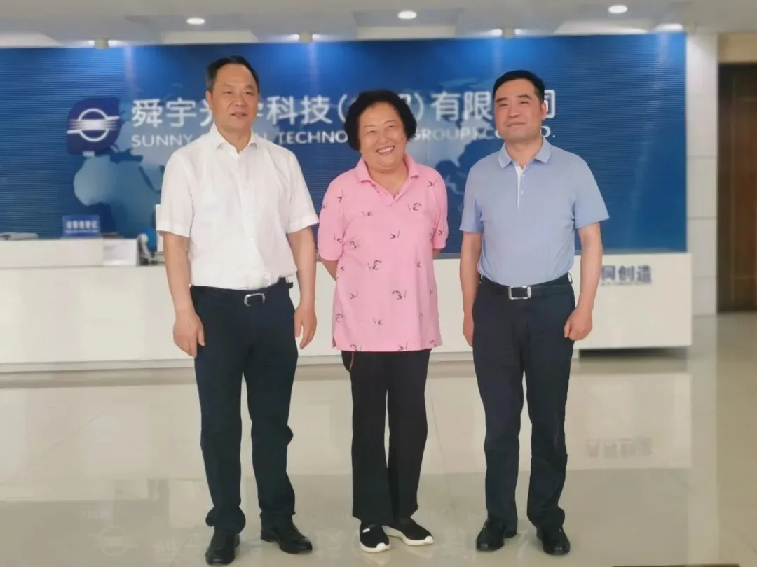 趙白鴿主任調研舜宇集團,余姚市市委書記奚明(左一)、舜宇董事長葉遼陽(右一)陪同調研