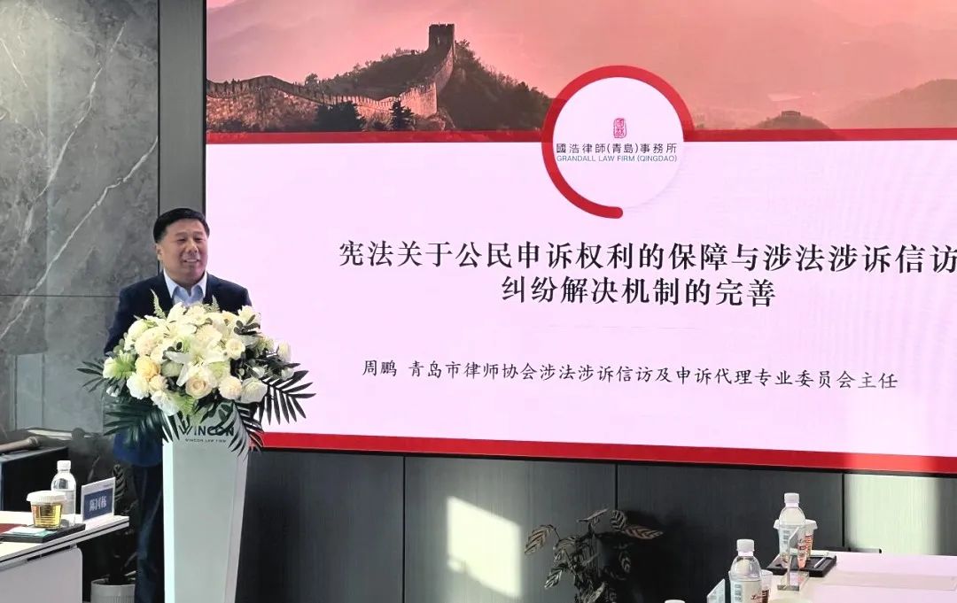 12月4日下午,國浩青島管理合伙人周鵬參加青島市律師協會憲法宣傳理論研討會,并作“憲法關于公民申訴權利的保障與涉法涉訴信訪糾紛解決機制的完善”主題演講。