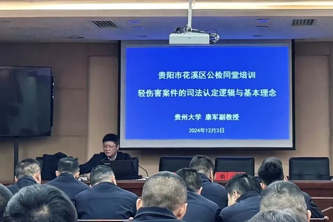 12月3日,貴陽市花溪區公檢同堂培訓會于花溪區人民檢察院召開,國浩貴陽資深顧問康軍受邀出席并以“輕傷害案件的司法認定邏輯與基本理念”為題開展主題講座。花溪區人民檢察院黨組成員、副檢察長季勇主持此次會議,花溪區人民檢察院、花溪區公安局相關部門政法干警參會。講座結合憲法,圍繞當前社會形勢下的刑事法治建設背景、輕傷害案件認定的基本法治邏輯、輕傷害案件辦理常見問題及解析進行了精彩分享。