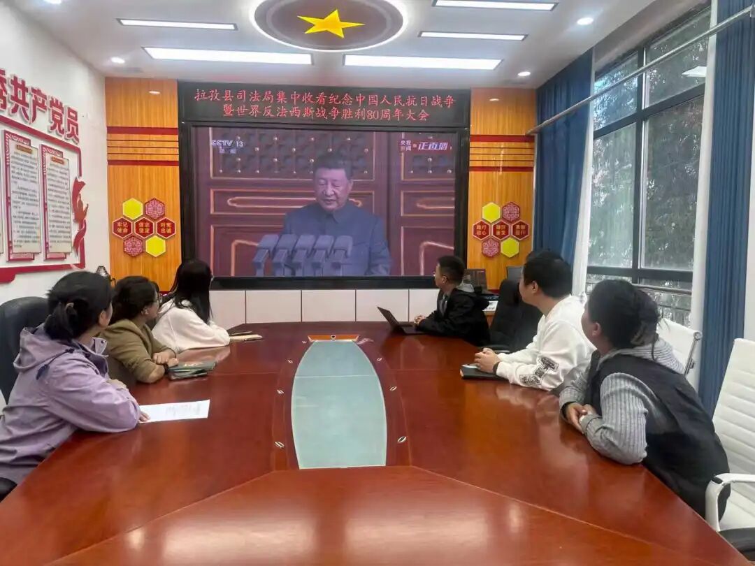 青藏高原上,拉孜縣司法局組織黨員干部及國浩拉孜駐藏律師等聚集在司法局二樓會議室中,以全體起立共唱國歌的方式開啟了觀看大會直播活動。