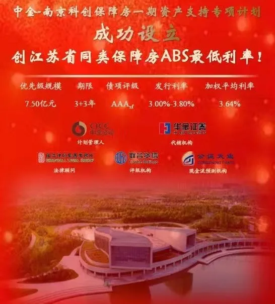 2021年6月,南京市科技創(chuàng)新投資有限責(zé)任公司(簡稱“南京科創(chuàng)”)參與設(shè)立的“中金-南京科創(chuàng)保障房一期資產(chǎn)支持專項(xiàng)計(jì)劃”獲得深圳證券交易所的通過,2021年8月,該專項(xiàng)計(jì)劃完成簿記發(fā)行。據(jù)悉,中金-南京科創(chuàng)保障房一期資產(chǎn)支持專項(xiàng)計(jì)劃募集資金規(guī)模為7.9億(其中優(yōu)先級規(guī)模為7.5億元),計(jì)劃管理人為中國國際金融股份有限公司,專項(xiàng)計(jì)劃的期限為3+3年,底層基礎(chǔ)資產(chǎn)為南京市麒麟經(jīng)濟(jì)開發(fā)區(qū)一期保障房銷售收入,債項(xiàng)評級為AAA,發(fā)行利率為3.00%-3.80%,加權(quán)平均利率為3.64%。該專項(xiàng)計(jì)劃的利率也開創(chuàng)了江蘇省同類保障房資產(chǎn)支持證券的最低利率。