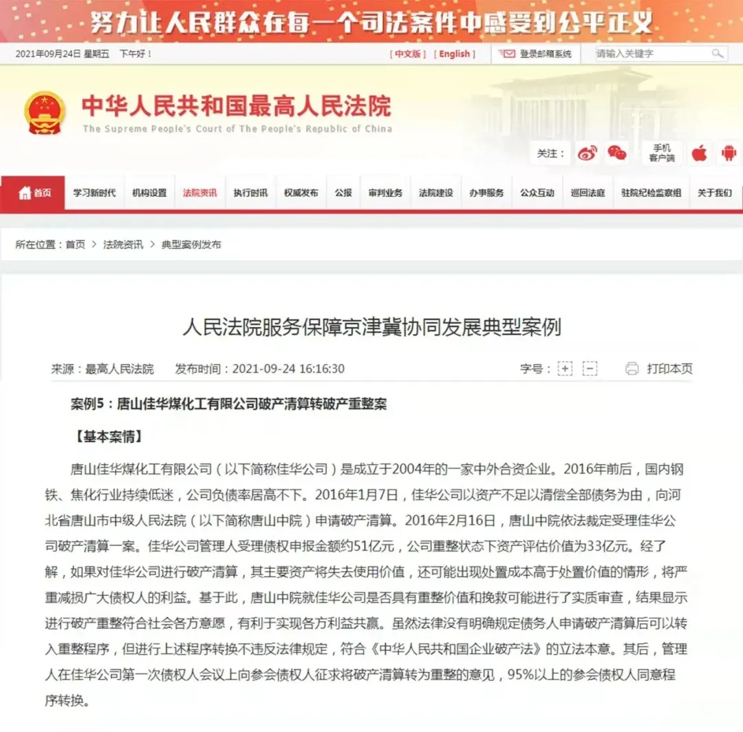 近日,最高人民法院發布了人民法院服務保障京津冀協同發展5起典型案例,國浩石家莊辦公室擔任管理人的唐山佳華煤化工有限公司(以下簡稱“佳華公司”)破產清算轉破產重整案成功入選。最高人民法院對本案作出評價: