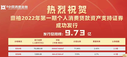 近日,河南中原消費金融股份有限公司(以下簡稱“中原消費金融”)鼎柚2022年第一期個人消費貸款資產支持證券成功發行,本期資產支持證券的發起機構是中原消費金融,發行總規模9.73億元,優先A檔的信用級別為AAAsf級,優先B檔的信用級別為AA+sf級。國浩鄭州辦公室受聘擔任本次發行的專項法律顧問。